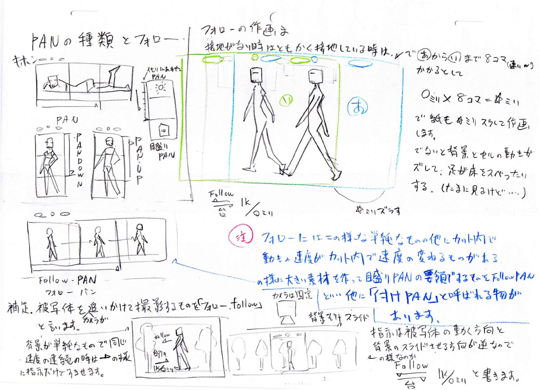 似たものとして一応カメラは追いかけてはいるが、特に目盛りなどが必要ないときは、フォローパンという言葉は使わずPAN で済ませます作画上や、タイムシートに書く撮影指示ではPANだけど、打ち合わせのときなんかは「ここは手につける感じでPAN 」とかいった感じで言う