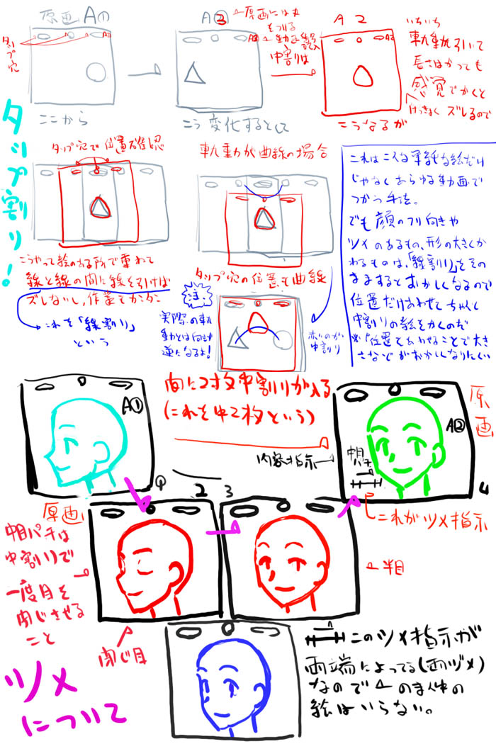 走りや歩き、まっすぐの動きなどわかりやすいものや基本的なものは、指示が原画にないことが多いが、演技や動き上弧を描くものなどはだいたい後の原画のほうに書かれていることが多い